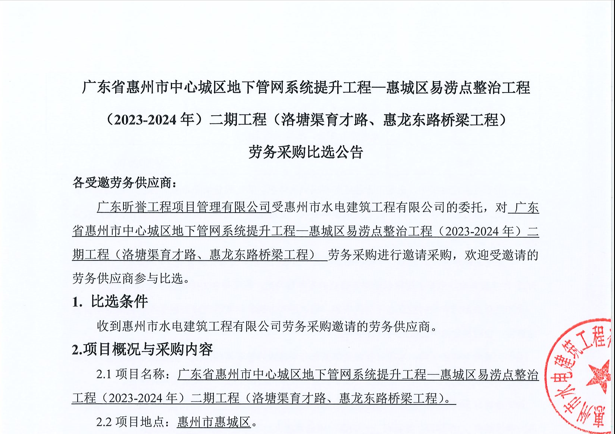 廣東省惠州市中心城區(qū)地下管網(wǎng)系統(tǒng)提升工程-內(nèi)街小巷排水管網(wǎng)病害修復(fù)及錯混接改造項(xiàng)目一期施工勞務(wù)采購(第二次)中選候選人公示……